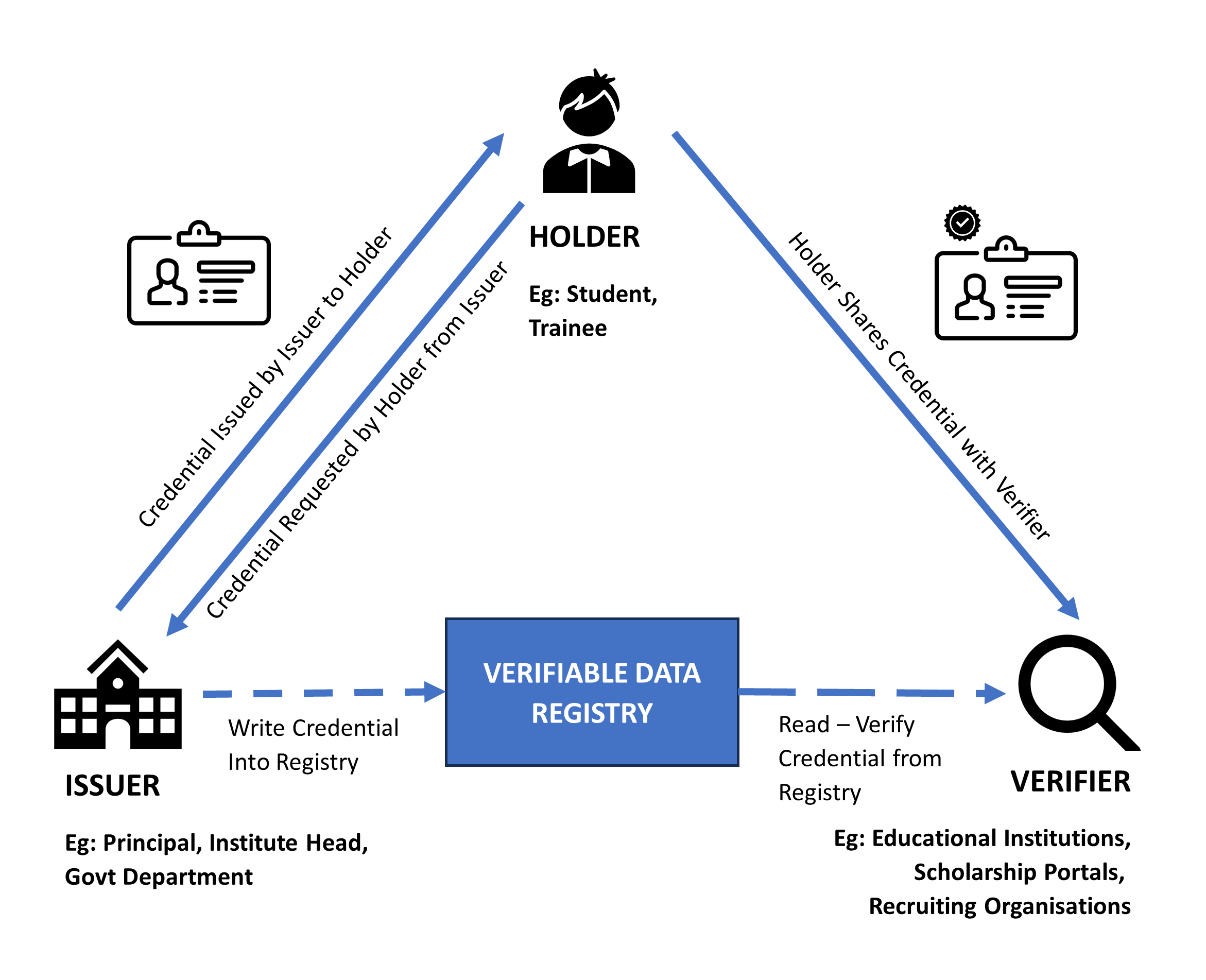 ULP involves an ecosystem of 3 actors namely the Issuer, the Holder and the Verifier interacting with each other on a level of digital trust backed by a governance authority. The Issuer is in charge of issuing verifiable credentials to the Holder which is stored in a central Verifiable Data Registry. The Holder can share the issued credentials with Verifiers for an opportunity or benefit. The Verifiers can verify the authenticity of the credential by reading from the Verifiable Data Registry. A system of mutual trust is formed where the governance authority (who is trusted by the Verifier) trusts the Issuer. By transitive trust the Verifier trusts the Issuer resulting in a high trust ecosystem overall.