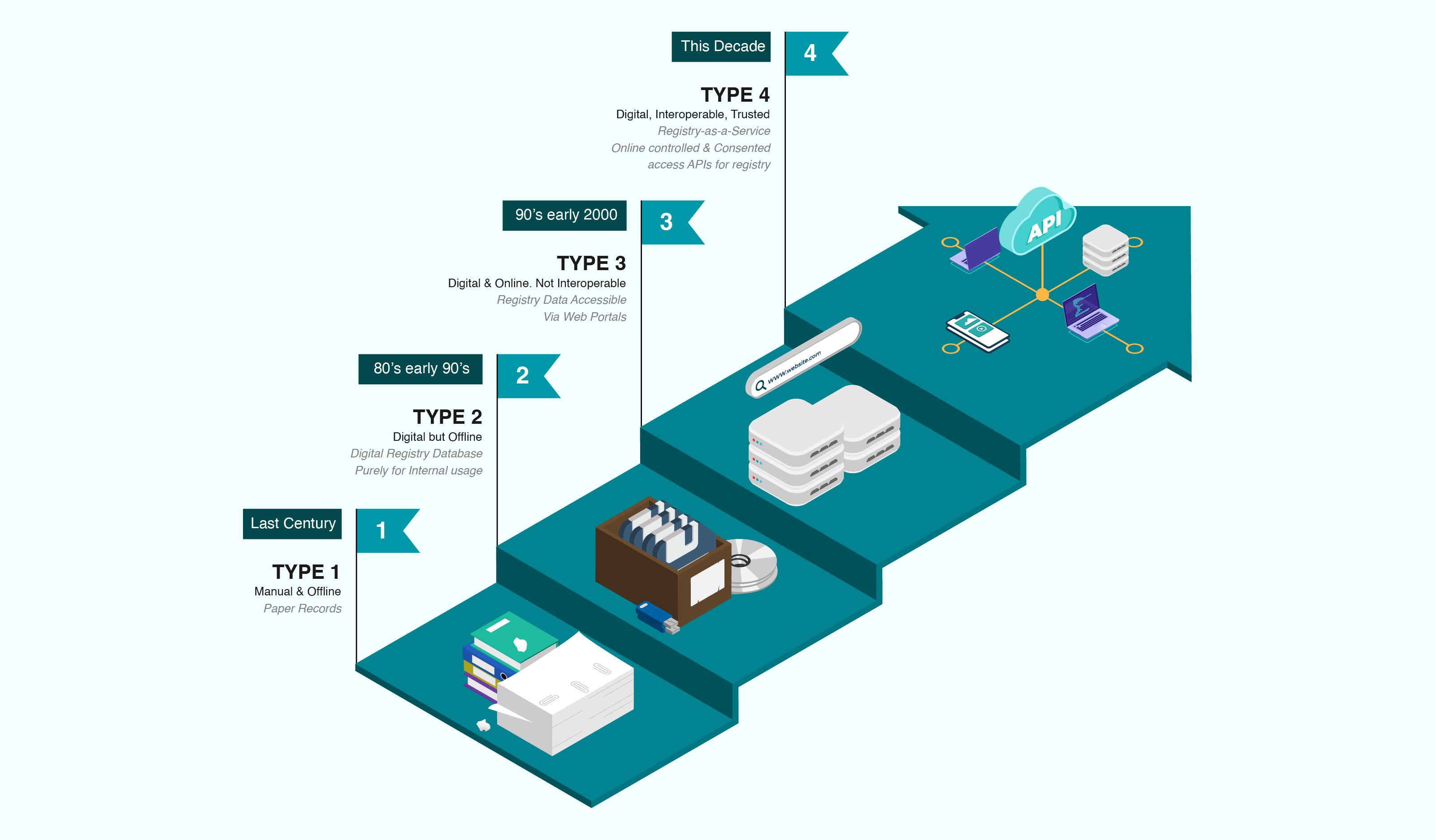 The 1st generation of registries were purely a paper-based list maintained in registers. As part of early computerisation, such lists got digitised giving birth to the 2nd generation of registries. They were digitised data, but typically maintained in an internal database.